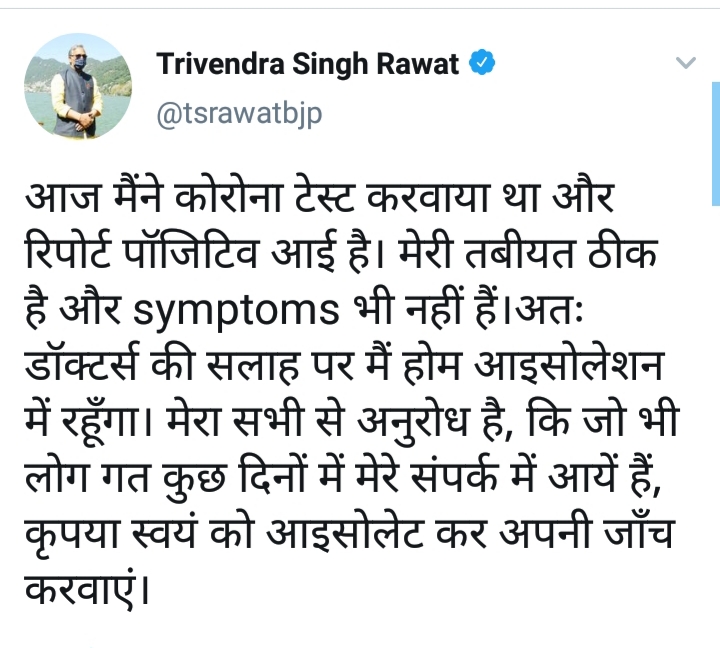 फिर मुख्यमंत्री त्रिवेंद्र ने तत्काल खुद ट्वीट कर यह जानकारी साझा करते हुए लिखा कि, ‘आज मैंने कोरोना टेस्ट् कराया था और रिपोर्ट पॉजिटिव आई है। मेरी तबीयत ठीक है और कोई लक्षण भी नहीं हैं। डॉक्टतरों की सलाह पर मैं होम आइसोलेशन में रहूंगा। मुख्यममंत्री ने अनुरोध किया कि जो भी लोग पिछले कुछ दिनों में उनके संपर्क में आए हैं, वे स्वायं को आइसोलेट कर अपनी जांच कराएं।’